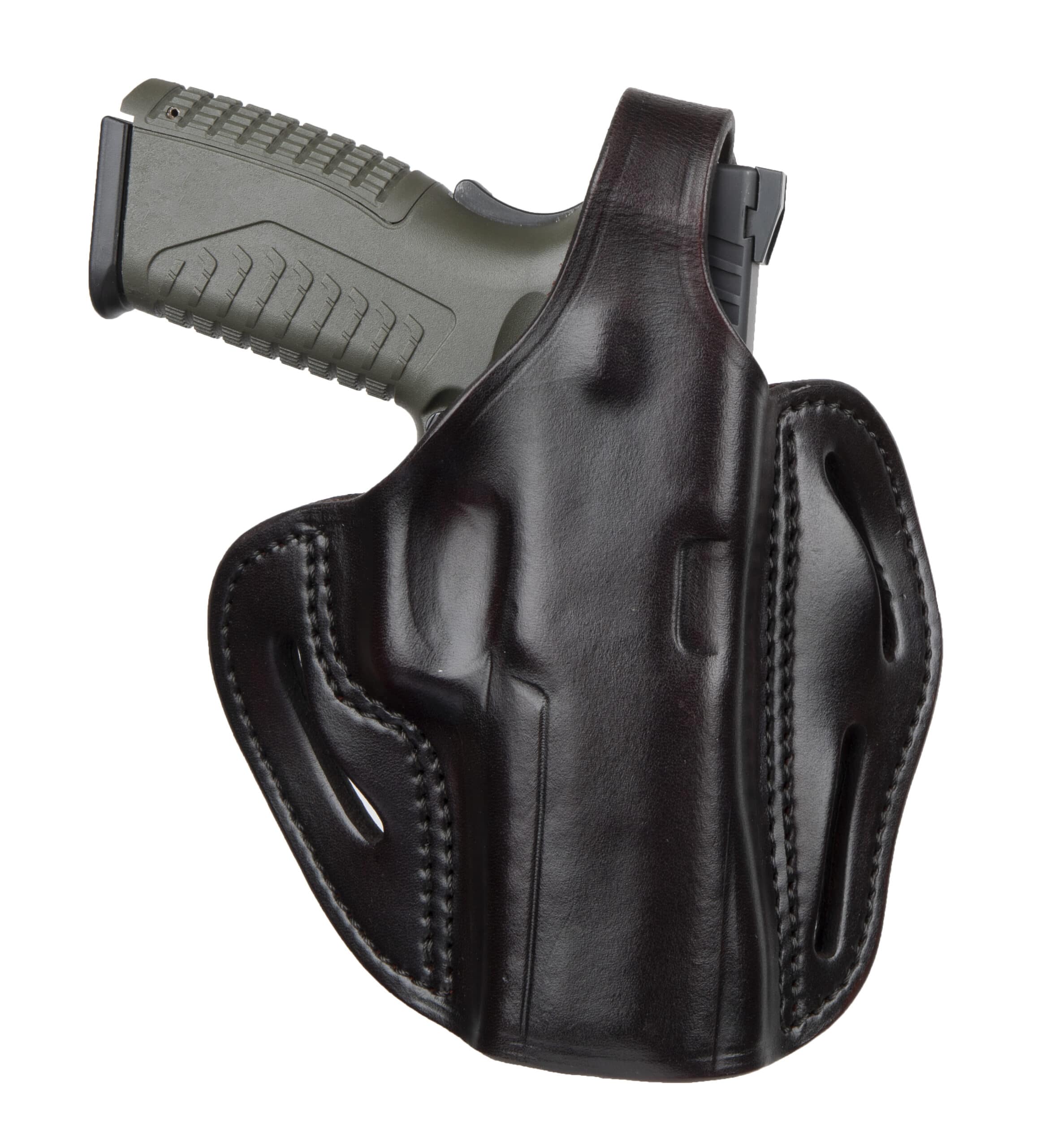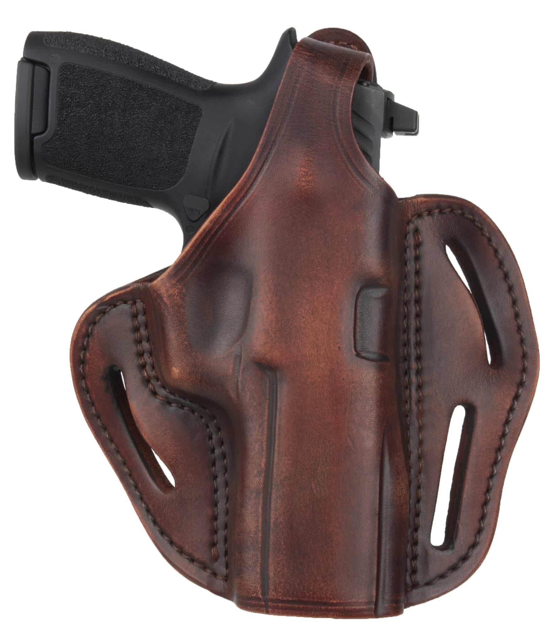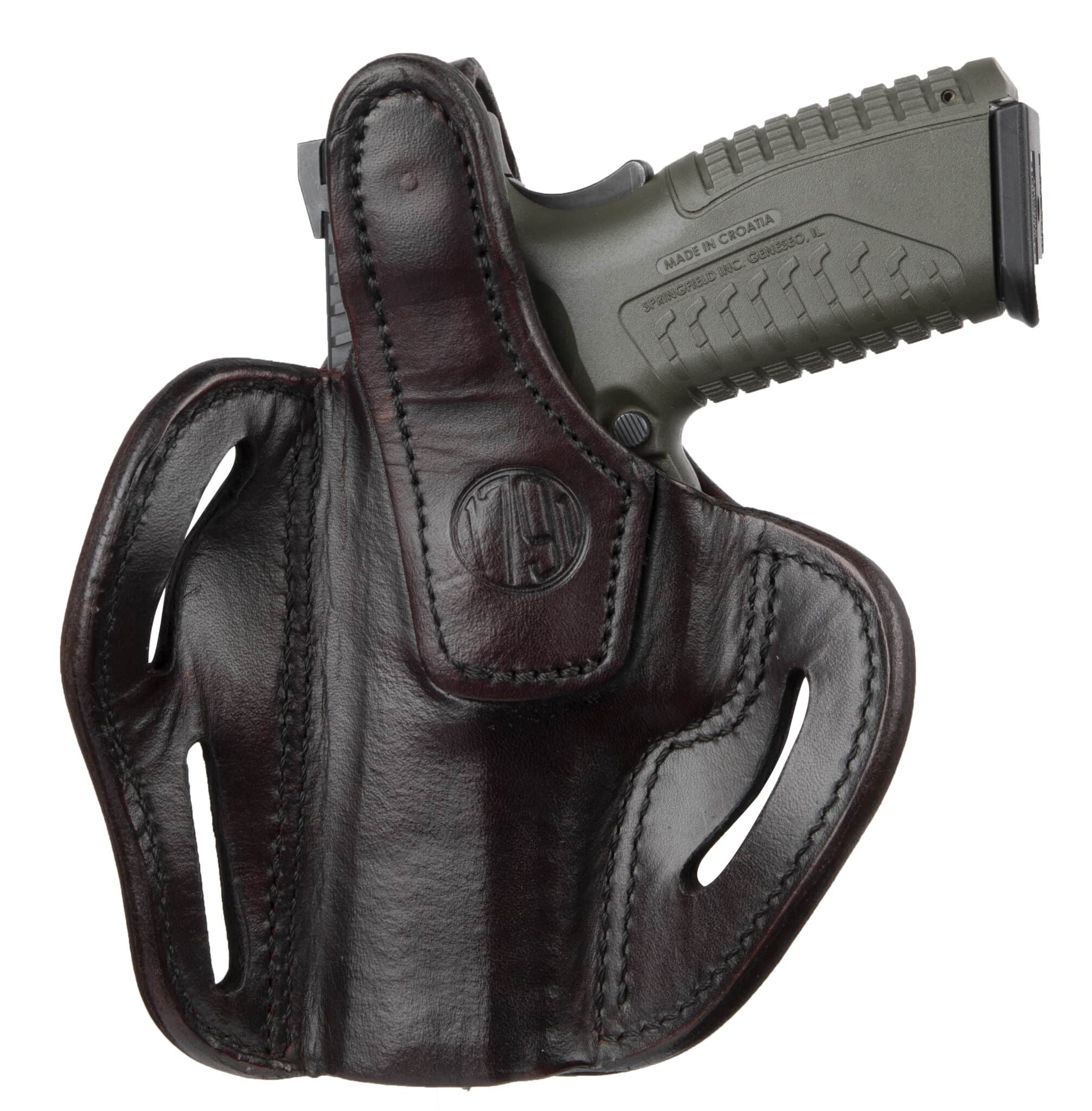 The BHX delivers incredible retention and superior leather and build quality. It also includes 3 belt loops that allow you to carry two distinct positions. The FBI-Cant allows for a quick reaction draw of your weapon and the Back-Cant is intended for quicker pickup of your target, especially useful when sitting or driving. The BHX is a high-end leather design that is molded and contoured for your pistol and accommodates taller Suppressor Sights, yet is comfortable against the body due to the handcrafted premium 100% Certified American, Heavy Native Steerhide leather. This holsters interior is hand-finished to help protect the bluing of your pistol and includes design enhancements like a reliable Thumb Break, multi-cant positioning options on the belt, double stitching for reinforced life-time enjoyment, and more barrel room for higher front-sights.